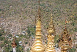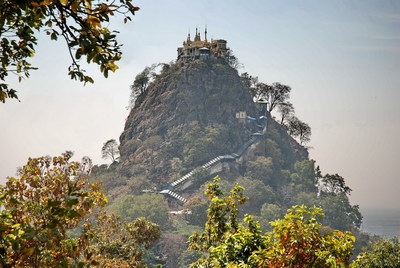 Высота горы 750м над окрестностями (1518м над уровнем моря). Не так высоко, но необычно, что на верхушке горы, крепко примостился храм духов. В одном из залов есть таблички, на которых указаны имена и сумма денег. Можно сказать, что не только название горы привлекает нашего брата. И еще, бирманцы верят, что по части исцеления – Попа одно из самых чудодейственных мест.