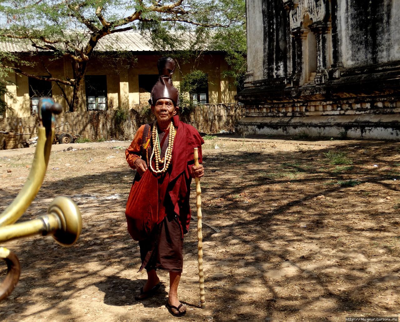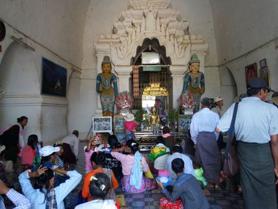 тоже имеет квадратное внутренее сечение, но здесь простые коридоры и Будды в них сидят. Храм , похоже , действующий, она удивилась, увидев в нем молящихся людей.В период расцвета Багана храм Татбинью представлял из себя целый храмовый комплекс с монастырем, библиотекой и святилищем и был огорожен толстой кирпичной стеной.