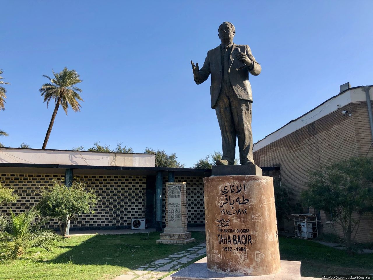 Во дворе музея стоит памятник Тахе Бакиру, возможно самому значимому из археологов Ирака 20 столетия. Ему принадлежит открытие Законов Эшнунны о нормах семейного, гражданского и уголовного права государства Эшнунна в 3 тысячелении до н.э, перевод одного из старейших литературных сочинений в мире "Эпоса о Гильгамеше", расшифровка вавилонских математических таблиц и раскопки многих городов Месопотамии включая Шадуппум, в котором собсвенно и были найдены таблички с эпосом о Гильгамеше и законами Эшнунны.