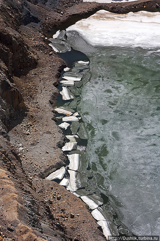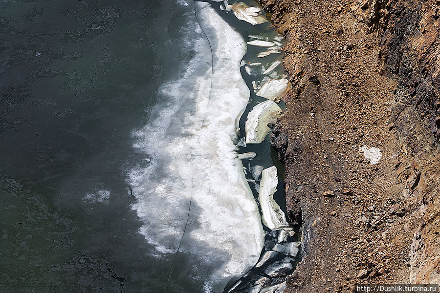 В первые дни мая вода в карьере ещё покрыта тонким слоем льда.