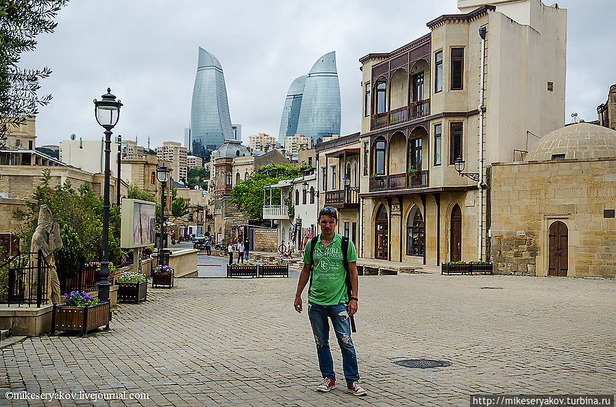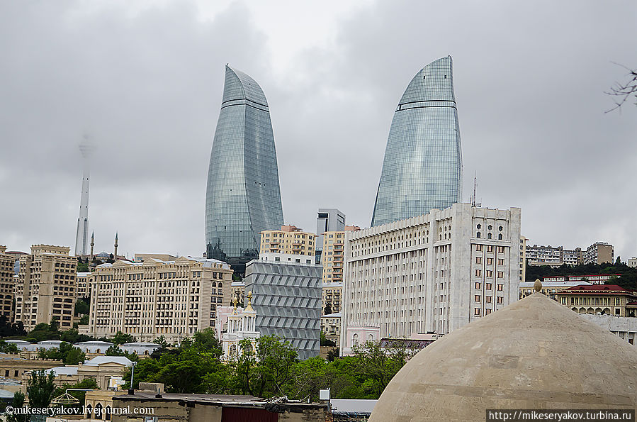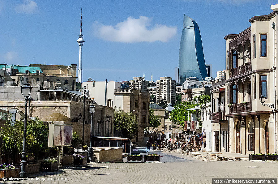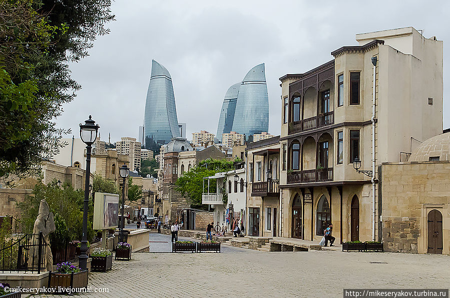 На следующей фотографии с улочки старого города видны самые высокие здания Азербайджана – знаменитые Flame Towers – символ современного Баку.