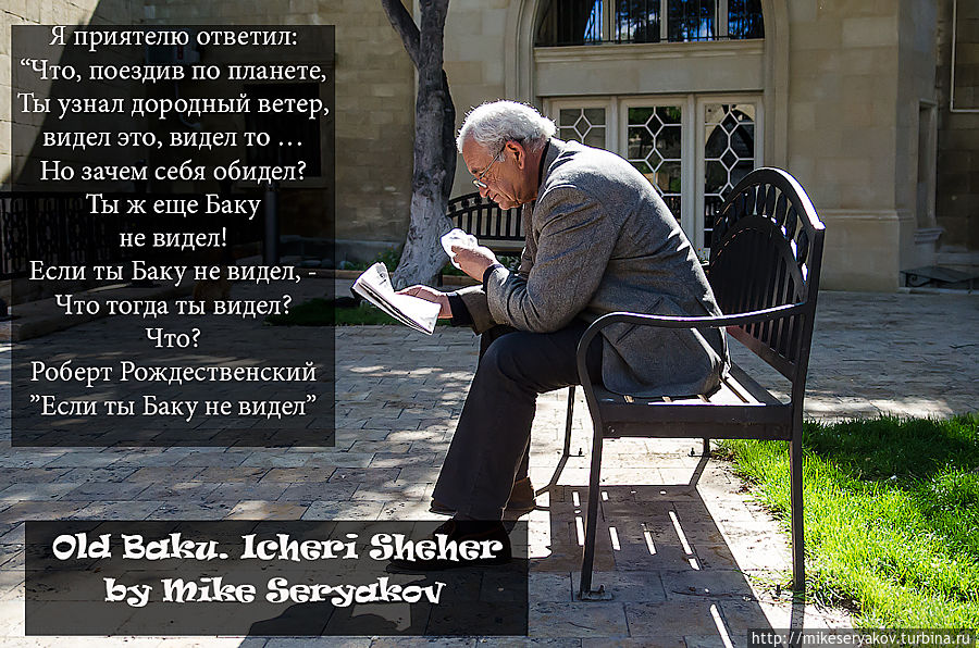 В Ичери-Шехере, наиболее древней части Баку, сейчас не только постоянно бродят туристы, но и проживает 1300 семей. Старый город — объект культурного наследия Юнеско в Азербайджане. Интересный памятник азербайджанскому поэту Алиаге Вахиду, у него на голове люди вместо волос, расположен уже внутри крепостных стен.