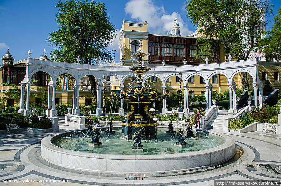 Это красивое здание на заднем плане — Азербайджанская государственная филармония имени Муслима Магомаева, в прошлом это был "летний дом для общественных собраний". Здесь очень часто выступают многие известные на весь мир музыканты.