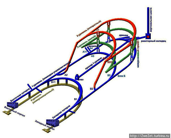 Мы посетили жилые и командные помещения. Там, увы, все разграблено. Кто-то в 90-е годы наворовал здесь миллионы, ведь одни только кабели из красной меди, проложенные здесь толстыми километровыми жгутами стоят немалых денег. Предусмотрены здесь были VIP-помещения для высшего руководства страны и флота. Они были оборудованы всем необходимым для комфортной жизни и работы, есть даже кинозал. У объекта было полностью автономное энергоснабжение. Мощности одного дизель-генератора хватило бы на освещение одного небольшого города. Инфраструктура объекта предполагала полностью оснащенную всем необходимым оборудованием базу для ремонта любой техники и систем жизнеобеспечения. Вот так выглядит схема этого объекта. На ней видно, что помещения располагаются в трех уровнях. Все уровни между собой связывают симметричные шахты.