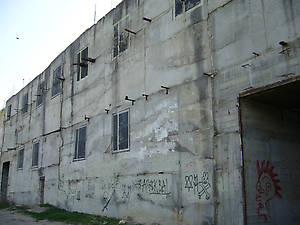 По лесной тропе мы вышли на асфальтовую дорогу, прошли вдоль подпорной стены, возведенной здесь против оползней, и вышли к зданию в скале. Окна на нем были нарисованы черной краской, — так объект маскировали под обычную двухэтажку.