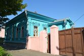 Стены дома украшает тёс в "ёлочку" , красивые наличники и разноплановая резьба. Водосточные трубы украшены драконами, только из под краски тут и там проглядывает ржавчина.