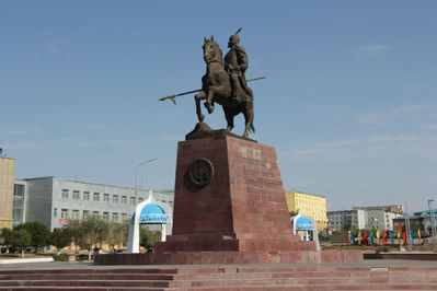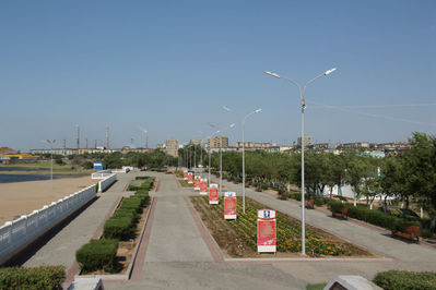 В Балхаше обнаружили, что припарковались недалеко от кафе. Дождались его открытия и вкусно позавтракали. Осмотр центра города, а с утра начинает припекать, и мы отправляемся на городской пляж, расположенный за Дворцом культуры. На набережной, около Вечного огня, ведутся ремонтные работы. Вода в озере теплая, приятно освежиться в такую летнюю жару.