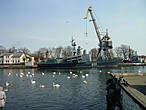Никогда в жизни я не видела столько лебедей как в Балтийске! Уверенные и наглые, они подпускают к себе совсем близко, рассчитывая на еду (кто поедет — прихватите с собой что-нибудь, а то мы боюсь их разочаровали; впрочем, местные жители активно подкармливают лебедей). Давайте порадуемся этим красавцам, а город и корабли будут просто фоном.