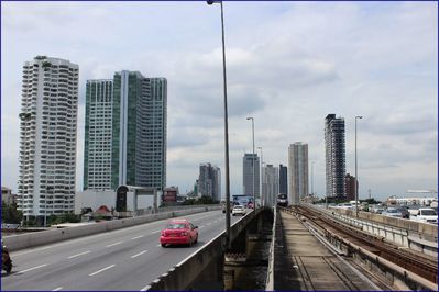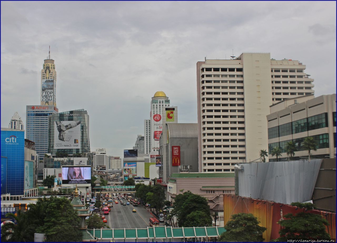 Собственно, — Sky Train, Небесный Поезд, — это несколько веток надземного метро, проложенных в том числе и самых оживленных, центральных районах. Самое удивительное, что поезд идет не просто по земле, а высоко, примерно на уровне 5-7 этажей. Именно поэтому, поездка на Скай Трейне не куда-то, а просто без всякой на то цели является настоящей обзорной экскурсией по Бангкоку. Причем вы видите город в очень выигрышном свете — на уровне макушек деревьев или чуть выше. Сразу становится понятно, что Бангкок — это не каменные джунгли, а раскиданные повсюду парки и зеленые зоны, между которых "понатыканы" необычные моему глазу, сияющие башни современных зданий. Именно таково было мое первое впечатление о столице Тайланда.