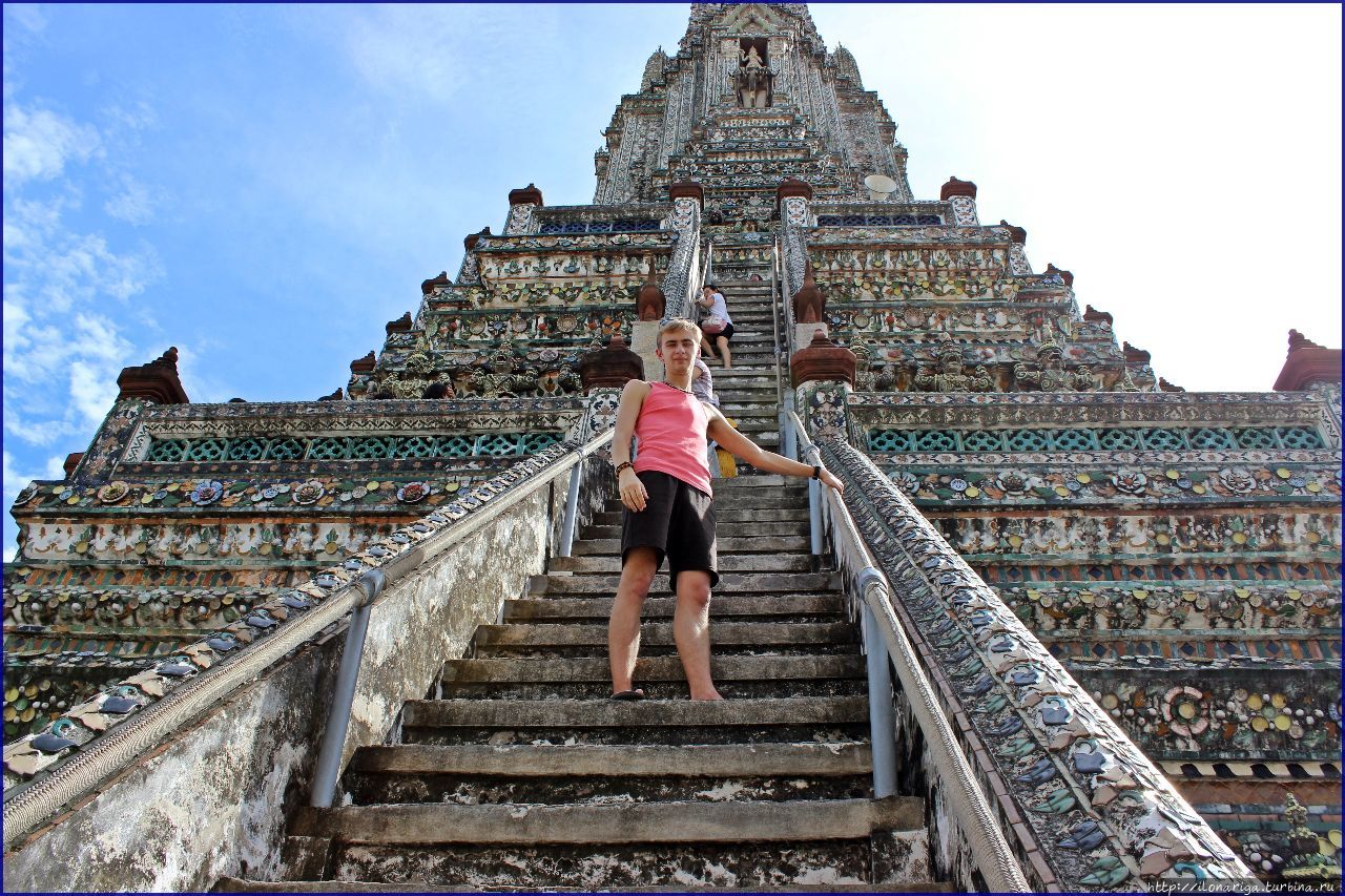 Храм очень красив! Он переливается красками битого китайского фарфора, облепившего все башни. Идея украсить стены кусочками, а то и целыми блюдцами разноцветной китайской посуды принадлежала брату короля Тайланда того времени Раме III. Центральный пранг (башню), высотой целых79 метров, строили очень долго, почти полгода, а битый китайский фарфор, используемый в виде балласта на кораблях, видимо, девать было совсем некуда:) Вот и сгодилось для отделки:)