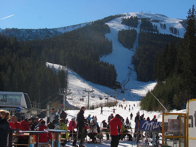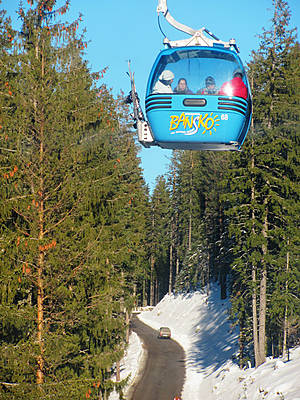 Природа замечательная и во время долгих подъёмов на фуникулёре можно вовсю налюбоваться заснеженными горами и хвойными деревьями, а внизу, если приглядеться, меж сосен и елей видны многочисленные заячьи следы, а кое-где и лисьи.