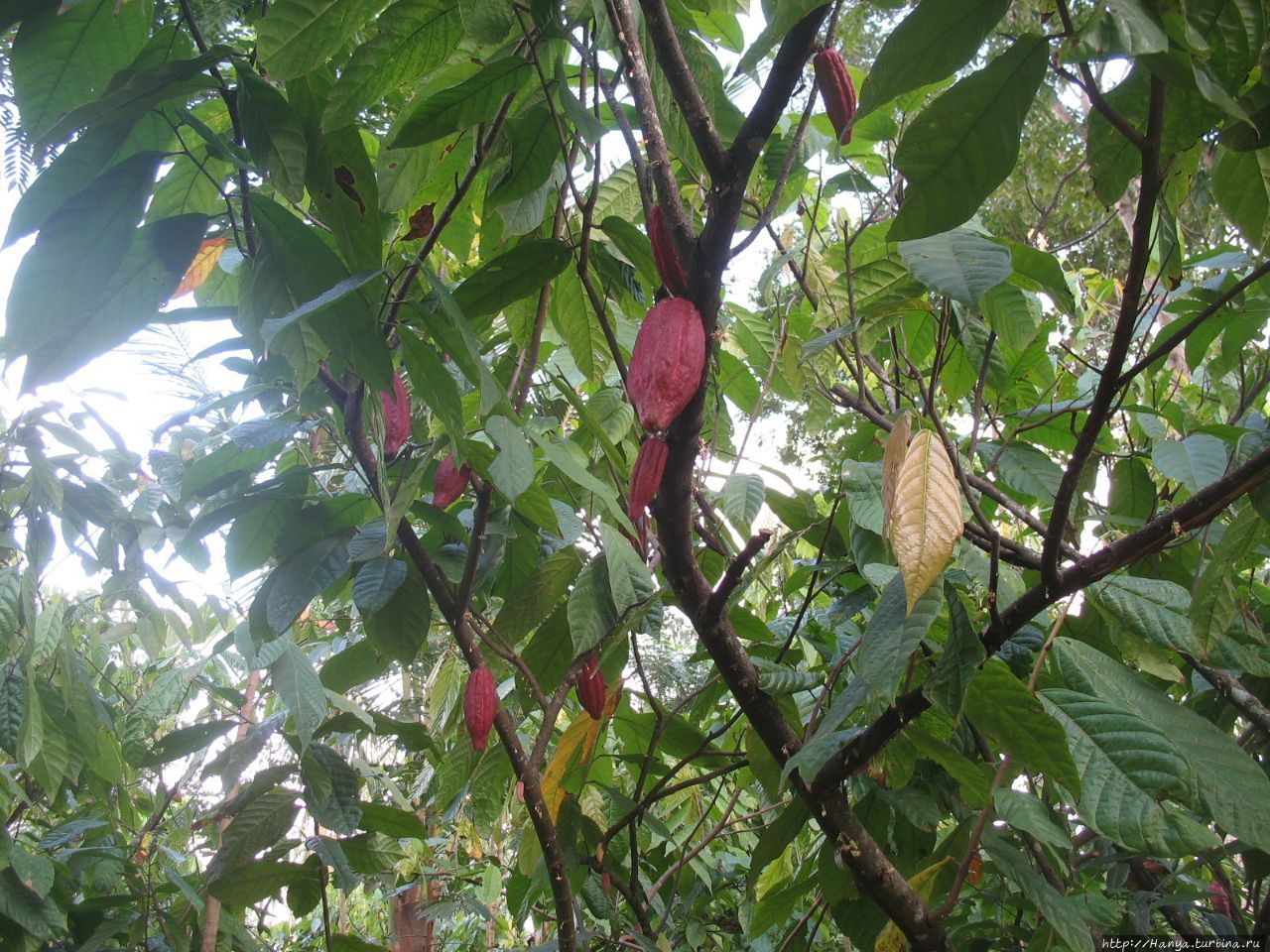Уединенный эко-отель Margo Utomo Guest House. Ч.26) в 7 утра, и быстро миновали Калибару – небольшое село с многочисленными плантациями кофе. Примечательно, что местное население верит, что в этой области проживают последние тигры Явы. Думая, что находимся в получасе езды до порта, мы рассчитывали попасть на первый паром. Оказалось, что в порт мы приехали к 9.30. Тому есть объяснение. Несмотря на то, что мы не захотели посетить сад специй, Ирован все же решил показать нам снова «другую природу», но уже бесплатно. Он неожиданно остановил машину и рукой показал нам на деревья, растущие на другой стороне дороги. Впервые в жизни мы увидели, как растет какао. Перебежав дорогу, мы попали в целый сад какао-деревьев. Это было вторым сильнейшим впечатлением в нашей поездке. Большие, сантиметров по 20 в длину, плоды ярко бордового цвета буквально облепили ствол и ветви дерева.