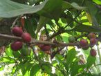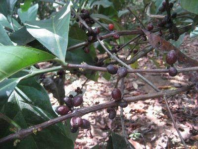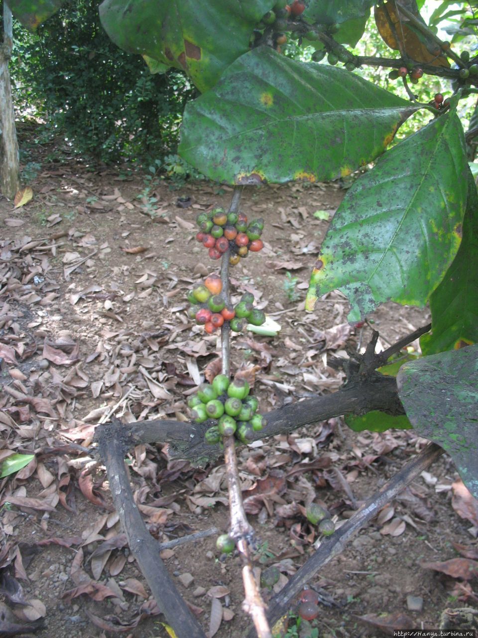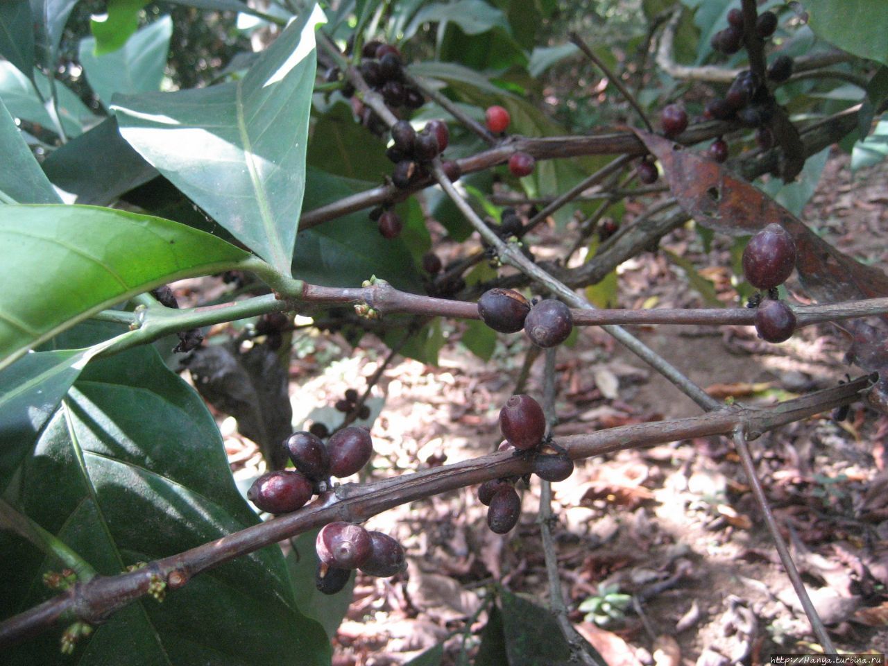 Следующей была остановка для ознакомления с кофейными деревьями, представляющими вечнозеленый кустарник или небольшие деревца. Как и какао, кофе родом из тропических стран, из 40 коммерческое значение имеют только 19 видов деревьев. И только 3 обеспечивают экспортную продукцию для последующего приготовления популярнейшего одноименного напитка – кофе. Листья на деревьях темно-зеленые, глянцевые, растут супротивно, плоды удлиненные бордового или фиолетово-синего цвета, собраны группами прямо на ветках. Местный дедок с интересом смотрит, как мы фотографируем экзотические плоды.