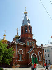 Никольская церковь, о ней уже есть в "советах". Построена в начале 20 века, русско-византийский стиль, таких храмов было построено 60 церквей в Российской империи. 1 из них в Гродно. В 1930-1980-ые здание использовалось под клуб военной части, а позднее Барнаульского высшего военного училища лётчиков. В 1991 передано РПЦ.