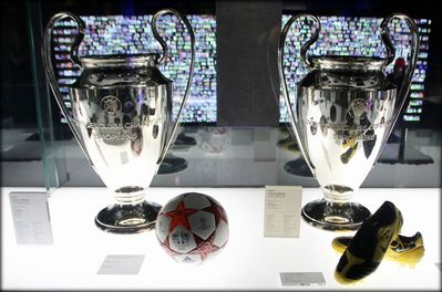 На экранах демонстрируют его голы. Под стеклом выставлены главные награды игрока: "Золотые мячи" и "Золотые бутцы".