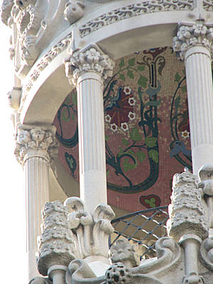 Перейдем к следующему дому. Дом Лео Морера (дом 35 ). В 1902 году глава семьи Антонио Морера-и-Бусо поручил реконструкцию этого здания Луису Доменек-и-Монтанеру, бывшему к тому времени уже одним из самых известных творцов каталонского модерна, конкурировавшим с самим Антонио Гауди. Заказчику не было суждено дожить до окончания строительства, работу в 1906 году принимал его сын Альберт Лео-и-Морера. В целях увековечивания имени владельца дома Доменек-и-Монтанер вплёл в орнамент, оформляющий здание, многочисленные изображения львов (Lleo) и тутовых деревьев (Morera).