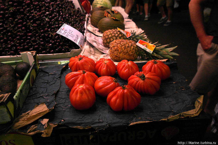 На рынке представлен широкий ассортимент фруктов и овощей со всех континентов, колбас, птицы, мяса, копченостей, вина, сыров, соленой и живой рыбы, хлеба, морепродуктов, солений и сладостей.