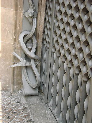 Въезд в виде параболических арок закрыт массивными кованными воротами, на каждых ажурной вязью искусно переплелись в единый орнамент инициалы заказчика. Такое искусное переплетение кованых решеток, петель, лент, растительных и цветочных мотивов вызывает восхищение. Это подлинный шедевр кузнечного искусства. Рассказывают, что во время установки этого кованого орнамента на фасад дома Гуэль и Гауди, наблюдавшие за работами с противоположной стороны улицы, увидели, как какой-то прохожий остановился перед скульптурой со словами: "До чего странная вещь!" Гуэль тогда сказал: "Теперь она нравится мне даже больше". Хотя это высказывание Гуэля приводят и при других ситуациях.