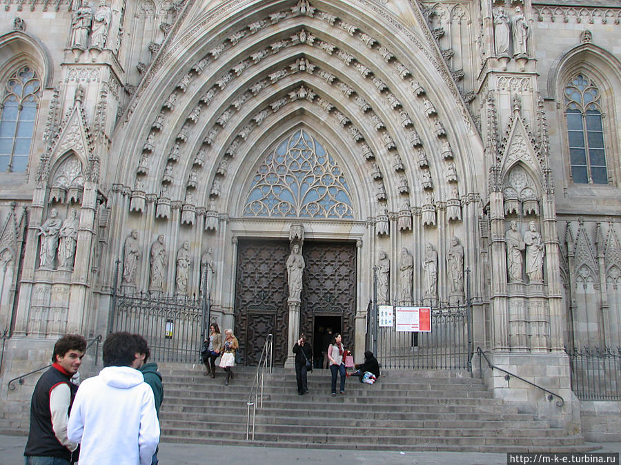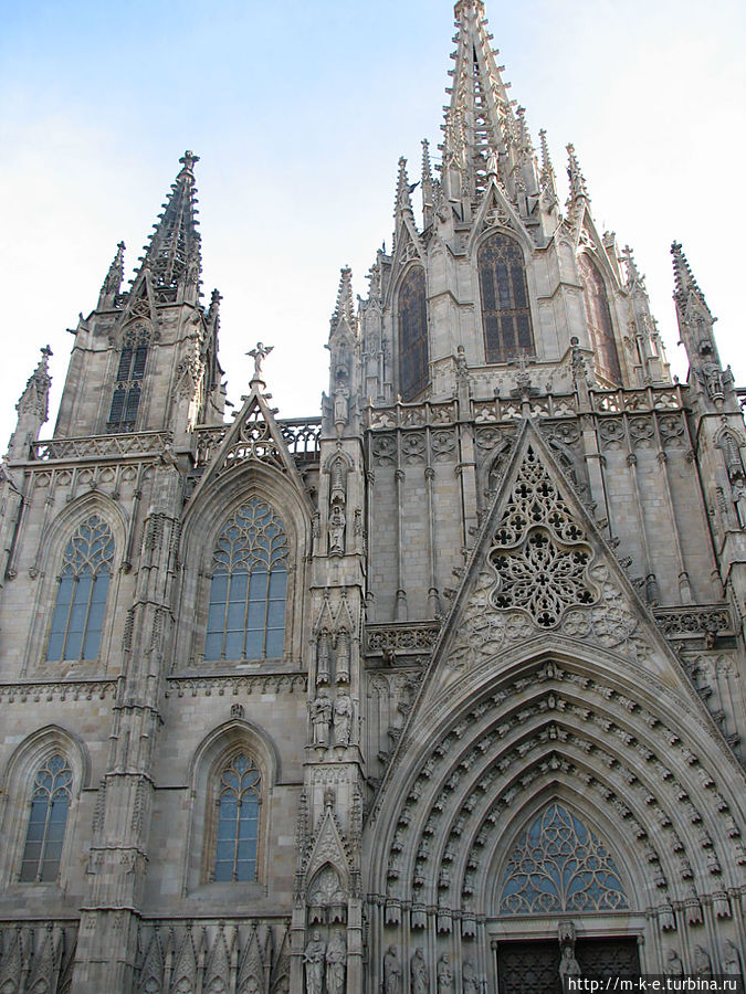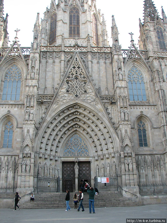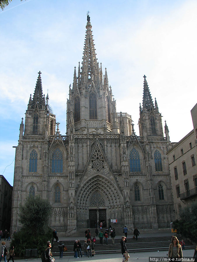 Ну а сейчас рассмотрим Кафедральный собор. Церковь построена в начале XIV века, отреставрирована в 1975-1981 годах. Собор был сооружен на месте древней христианской базилики святой Евлалии, мощи которой хранятся в крипте (1339 г.). Строительство было завершено в XV в., однако главный западный фасад был построен только в 1889 г., а шпиль в 1913 г. Строительство собора заканчивали по средневековым чертежам руанского собора, поэтому Кафедральный собор Барселоны сочетает в себе черты французской и испанской готики.