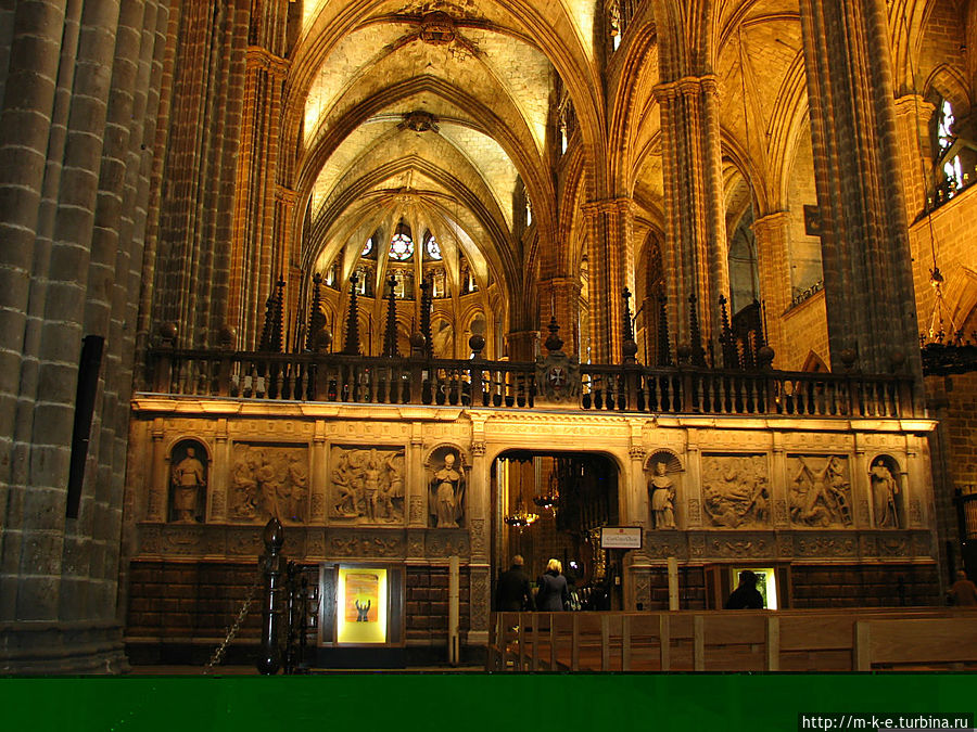 Внутреннее пространство храма характеризуется простором и недостатком света, в соборе всегда царит полумрак. Собор состоит из трех больших нефов, большую часть центрального нефа занимает обширный хор (1390). Ограждение в хоре включает мраморные рельефы известного испанского скульптора XVI в. Бартоломе Ордоньеса. За ограждением находятся знаменитые деревянные кресла, украшенные старинными геральдическими знаками каталонских рыцарей, представителей ордена Золотого Руна, которых в 1519 г. созывали в соборе император Карл V и эрцгерцог Максимилиан Австрийский.