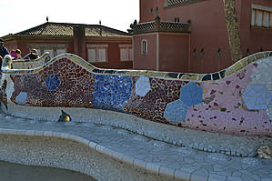 При создании декора этой скамьи А.Гауди сотрудничал с одним из своих учеников Ж.-М. Жужолём. Именно последний создал знаменитые коллажи из осколков керамических изразцов, битого стекла и других строительных отходов, опередившие многие произведения абстракционизма и сюрреализма.
