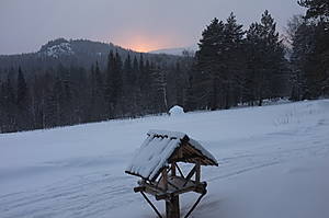 В национальном парке Зюраткуль, появилась лосиная ферма. Лосей привезли из старейшего питомника под Костромой. Живут лоси на Олимпиевом кордоне, не далеко от деревни Сибирка. Как-то, пару лет назад, мы тут колесили на велосипедах. Теперь решили заехать зимой, посмотреть на природный фонтан, летом он не так эффектно смотрится. Заодно прогуляться на лыжах, на какой нибудь хребет.