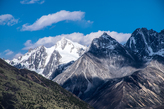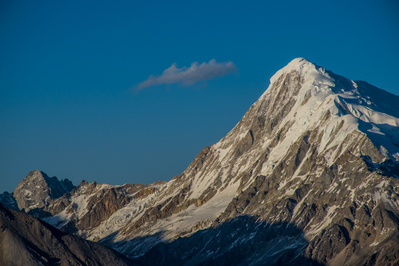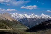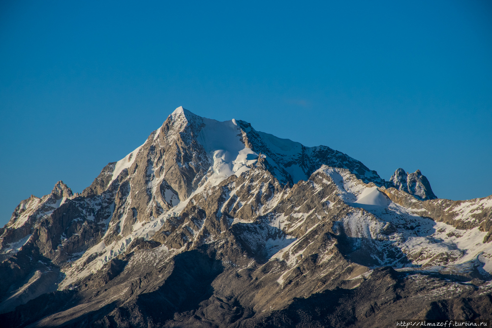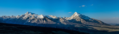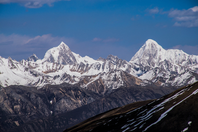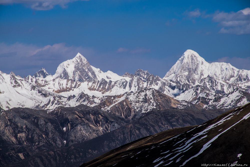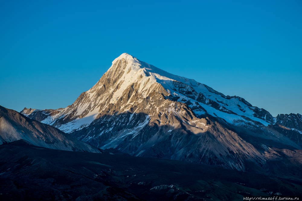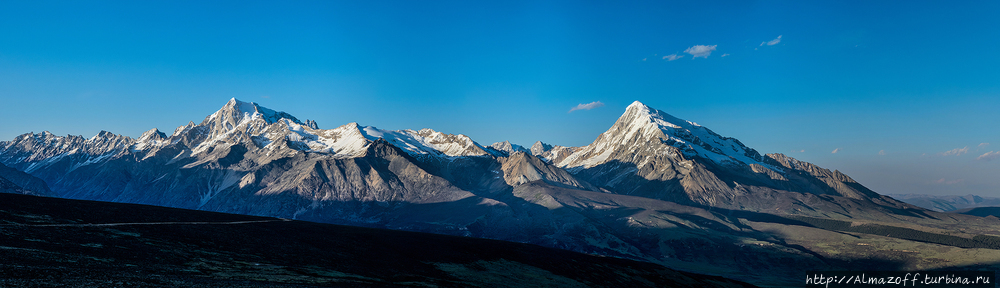 От последнего перевала открывается потрясающий вид на несколько вершин высотой более 6000 м. Одна из них, самая высокая (6200 м), называется по-тибетски Геньен Палсег. На закате очень даже.