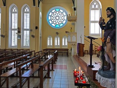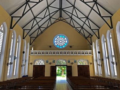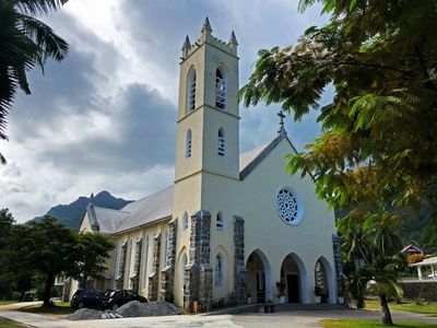 Католицизм на Сейшелах укрепился в середине 19 века. К этому же периоду в основном относятся и строения католических церквей. Наша церковь чуточку моложе, предположительно она была построена в первой половине 20 века.