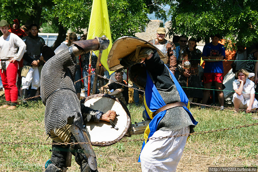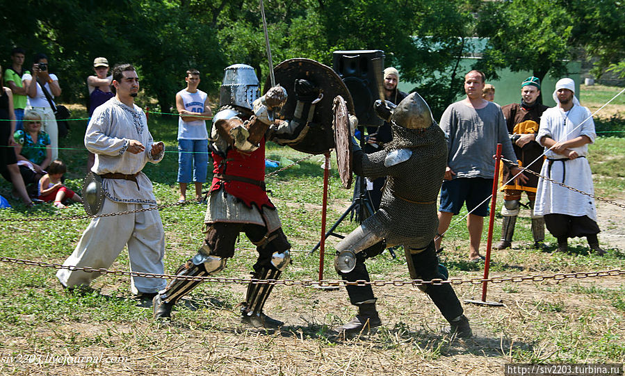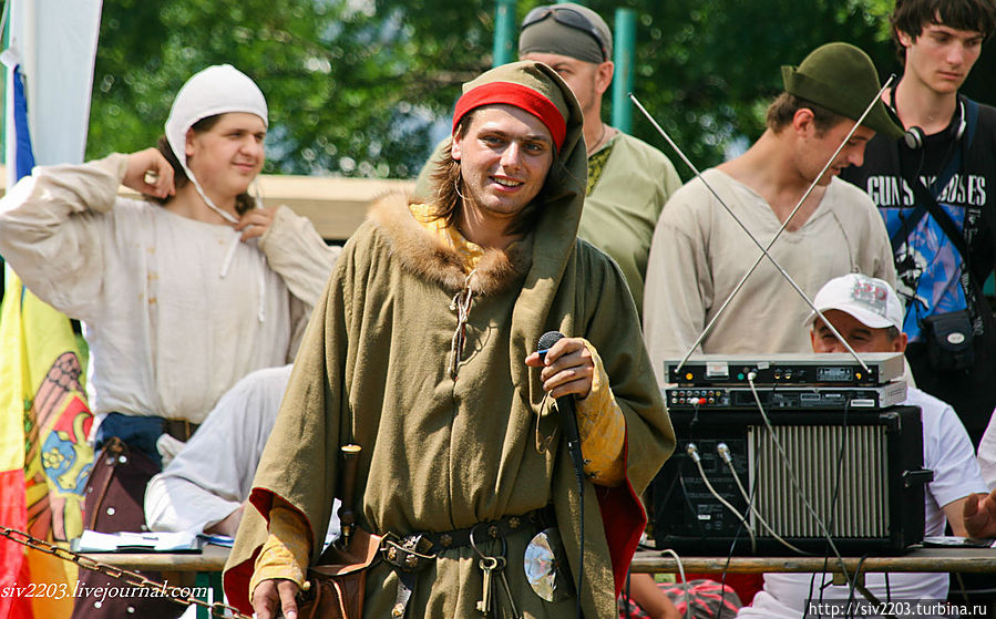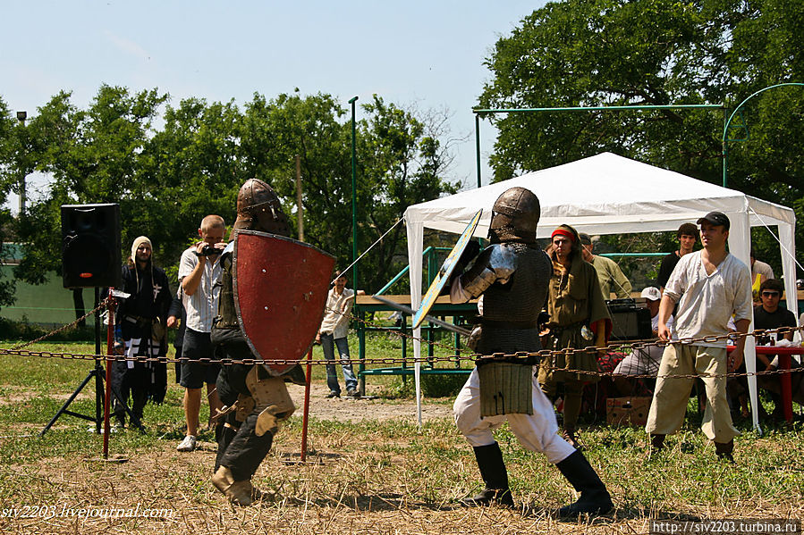 Пока рыцари бьются в честном бою, комментатор брызгая слюной пытается объяснить одуревшим от солнца зрителям, кто же побеждает в этой битве, и по чем холодные напитки в соседней будке Газ-воды.