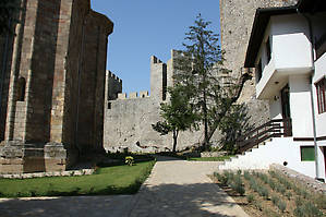 Монастырь Манасия выглядит как мощная крепость, стены толщиной в два метра и десяток башен по периметру. Ему через пару лет исполнится шесть веков, и за время османского владычества турки его несколько раз разрушали.
