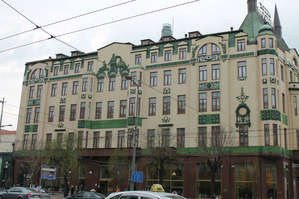 Рядом с фонтаном находится гостиница с ласкающем ухо названием "Москва". Построена она в 1906 году русским страховым обществом. Внешний вид здания сразу бросается в глаза. На фоне серых монолитных суровых зданий Москва, как нарядная барышня. Вся в желто-зеленом печуйском керамическом покрытии, символизирующим хозяйственную и военно-морскую мощь царской России. На протяжении всего века это было самое известное гостиничное сооружение города. Его кафе посещали многие местные знаменитости.