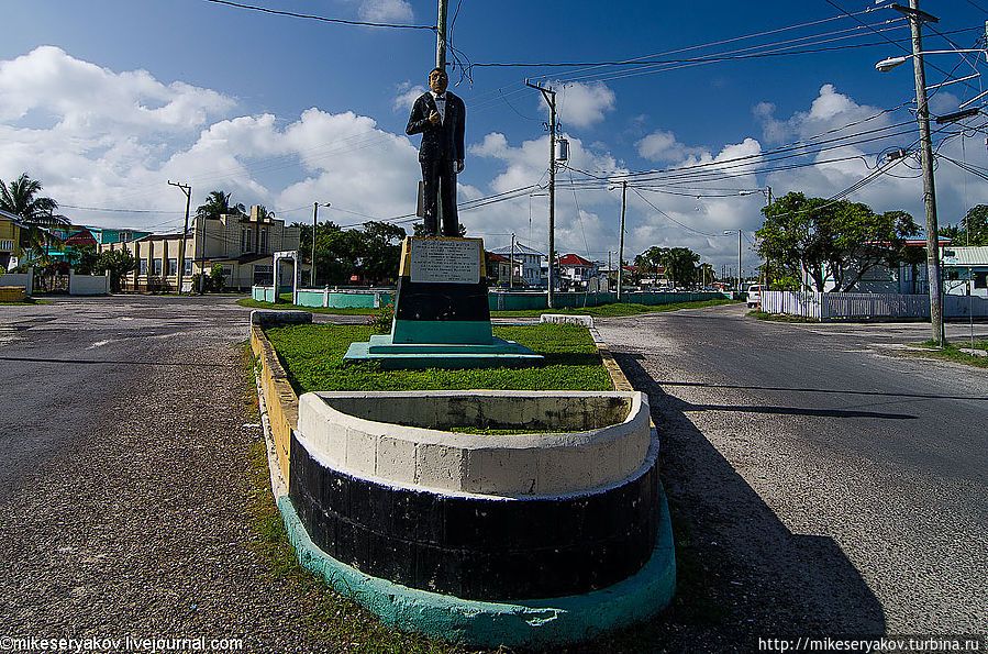 Это памятник сэру Isaiah Emmanuel Morter, он был потомков рабов, вывезенных в Белиз из Нигерии и стал первым «цветным» миллионером, выращивая бананы и кокосы, и продавая их. Интересно, каким «кокосом» он торговал, что стал миллионером.