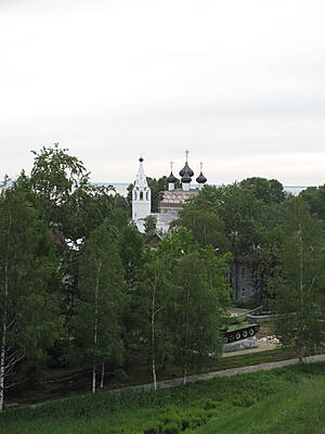 Мы оставили машину у информационного плаката рядом с основным входом в кремль. Повсюду были видны следы предыдущего весёлого вечера: мусор, пустые бутылки в самых неожиданных местах, окурки и прочая грязь. Тем не менее, мы исхитрились и смогли таки сделать более менее приличное фото композиции "Корабль и камень". Это памятник 1112-летию города, который, безусловно, очень украшает местность. По мосту надо рвом входим на территорию кремля. На склоне вала у входа белеет памятная надпись. Кремль окружён земляными валами, высота которых в средние века доходила до 30 метров! Существующий сейчас размер земляная насыпь детинца приобрела после значительного расширения кремля в 1487 году по приказу Ивана III. Первое, что попадается на глаза и, безусловно, восхищает — Собор Спаса Преображения (1668 — 1670). Решаем подойти поближе, а пока осматриваемся. Повсюду видны восстановительные работы. Мы понимаем, что возможность беспрепятственно попасть сюда в неурочный час обусловлена тем, что на исторической территории есть жилые дома. Видимо, людей потихоньку переселяют, так что, возможно, скоро кремль обзаведётся воротами и регламентированными часами посещения. Направо от входа располагается историческое здание Духовного училища (сейчас педагогический колледж). Почти у самого собора находится такой вот Памятный знак 625-летию Куликовской битвы. А всё потому, что в этой битве геройски погибла дружина с белозерскими князьями. Обходим Спасо-Преображенский собор. Это главный храм города, сейчас — музей. Здесь экспонируется часть собрания икон. Батюшка в городе один и служит в другом храме. Попасть внутрь мы не смогли, так как пришли очень рано, но зато толпы туристов не мешали прогулке. За собором увидели жилой дом — один из тех, что были построены здесь в советское время. Сейчас их потихоньку разбирают, поэтому то тут, то там видны горы мусора. Идём по тропинке и попадаем на берег живописного озерца, от которого слышен хор лягушек. Когда-то на территории детинца находилось пять озер, защитники в случае осады были обеспечены прекрасной питьевой водой. Сейчас осталось одно, два заболочены, а еще два были засыпаны при строительстве зданий. Обнаруживаем, что прошли детинец насквозь и решаем подняться на валы. Сегодня вал — это поросший травой и полевыми цветами холм, по гребню которого проходит тропинка. По кромке вала шли мощные оборонительные стены. Стены и восемь башен кремля разобрали еще в 1758 году. Но земляные валы остались. С них открываются хорошие виды на город и Белое озеро. По валу пробираемся к стоянке, а по пути замечаем интересную панораму "на контрасте" : православный храм и военный танк.