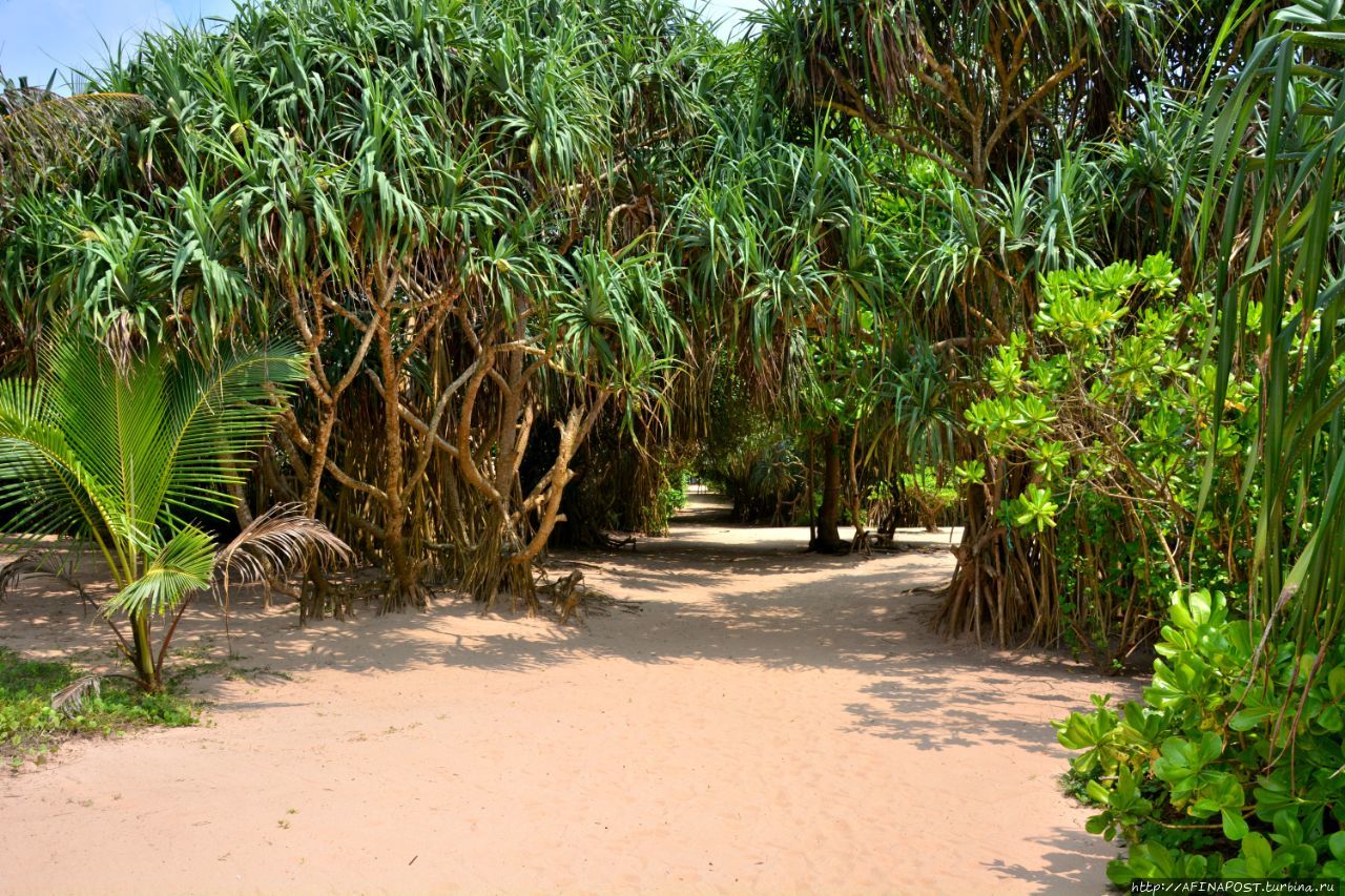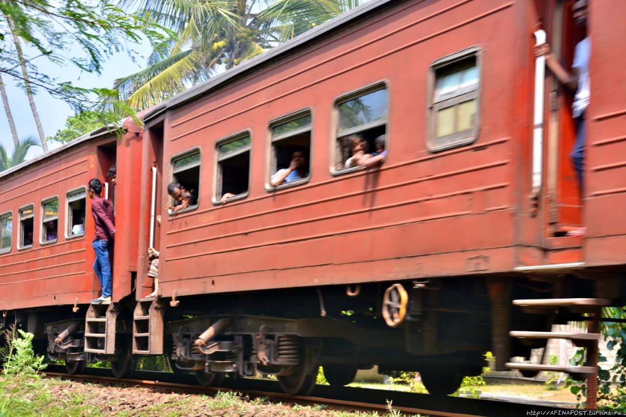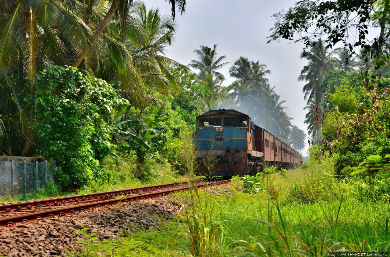 Грохочущей, с гудками, железной дороги, построенной англичанами, которая то приближается к берегу, то удаляется от него — это чугунка Коломбо-Матара.