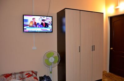 В номере не затейливо: новая мебель, холодильник, жк-телевизор, хороший Wi-Fi, туалет и душевая кабина, туалетные принадлежности, новые полотенца и постельное бельё.