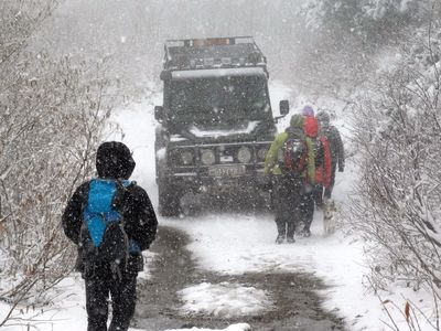 Спуск получился разнообразнее. Во- первых было скользко, во- вторых нам встретились иностранцы, которые на джипах поднимались на вершину, но как- то неудачно.