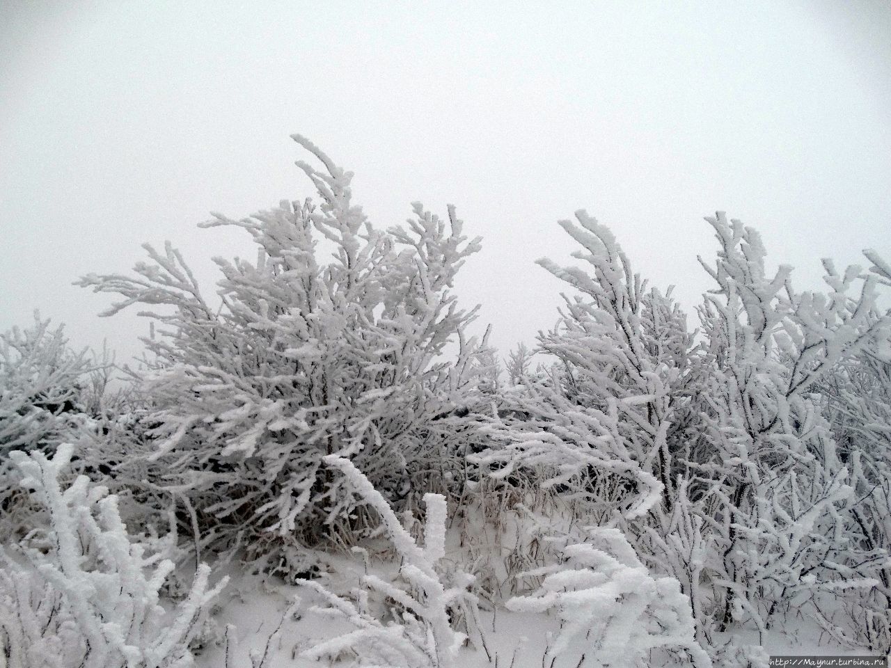 Вдоль дороги тянулся густой лес, падавший снег скрывал видимость и не было возможности снять соседние сопки. Сквозь разорвавшуюся на секунду пелену удалось сделать только один снимок,