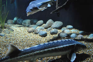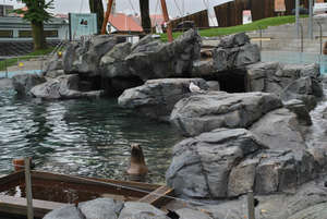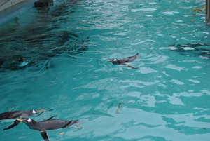 Перед зданием аквариума находится несколько открытых водоемов, где живут пингвины и морские львы.
