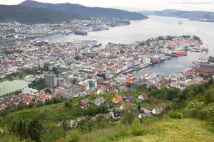 Вид сверху не разочаровал, хотя вот тоже — я его как будто уже видела. Берген – приморский город, и этим всё сказано. Он находится на полуострове, а от открытого моря его отделяют несколько островов. Город имеет маленькую уютную бухту Воген (Vågen), на которую как раз и выходит набережная Брюгге. Правда, со смотровой площадки ее плохо видно, она смотрит в другую сторону.