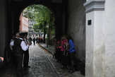 На подходе к крепости Бергенхус, услышали звуки гармошки. Думали, кто-то зарабатывает, а выяснилось, что это небольшой коллектив гармонистов. Спрятавшись от дождя в арке ворот, они играли задорные национальные мотивы.
