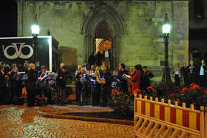 От него-то мы и узнали, что самое неудобное и трудное в игре на волынке – одновременно маршировать, играть и надувать мехи. После небольшого рассказа о коллективе и пары номеров, оркестр по команде все того же бородача, маршируя и играя, перемещался на другую площадку. Руководитель продолжал музыкальный ликбез, а музыканты надували мехи волынок. Таким образом, мы вместе со всеми зрителями прошли от площади Рыбного рынка (Torget) к башне Розенкранца. Здесь выступление закончилось под оглушительные аплодисменты.Концерт духового оркестра у стен Кафедрального собора