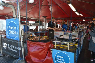 От очереди к фуникулёру до Рыбного рынка – метров 150-200. Он считается одной из главных достопримечательностей Бергена. Оно и понятно, ведь история этого рынка берёт своё начало в XII веке.