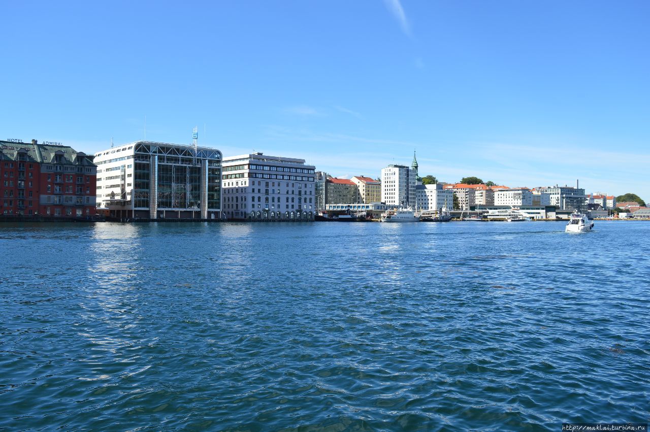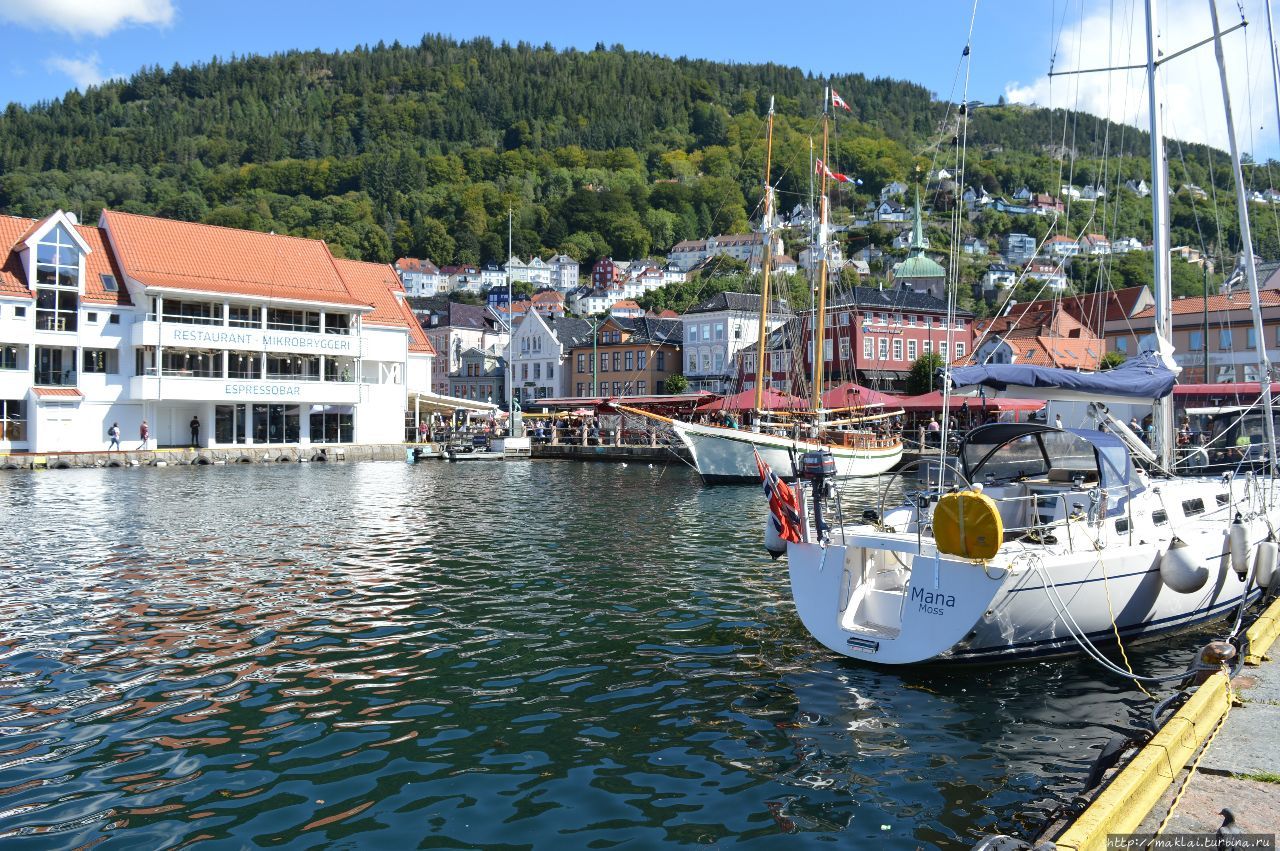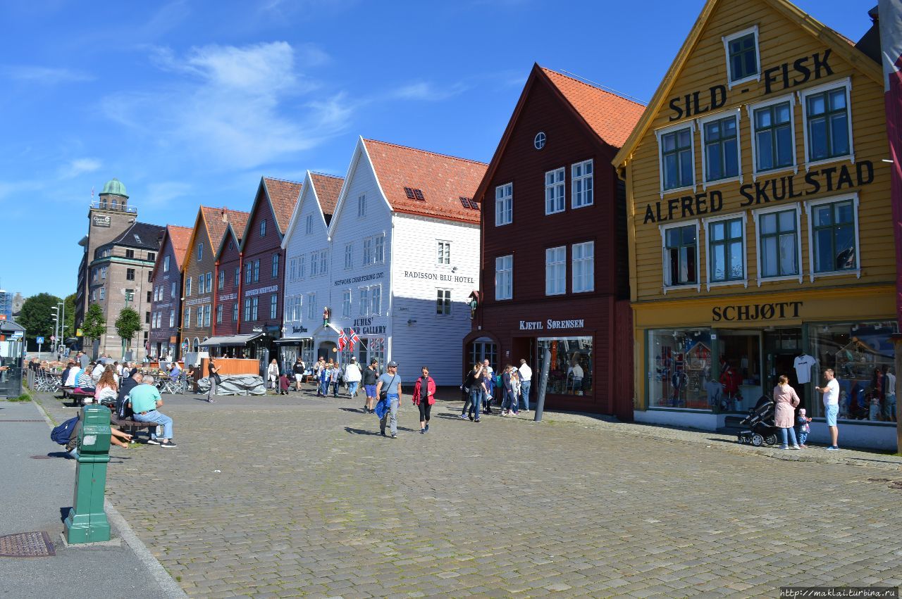 Пройдясь вокруг церкви, мы спустились к городской набережной. В целом, очень спокойный и немноголюдный Берген здесь весьма оживлён. Это едва ли не самое интересное место города. Это и не мудрено, ведь этот район включен во всемирное наследие ЮНЕСКО. Он называется Брюгген.