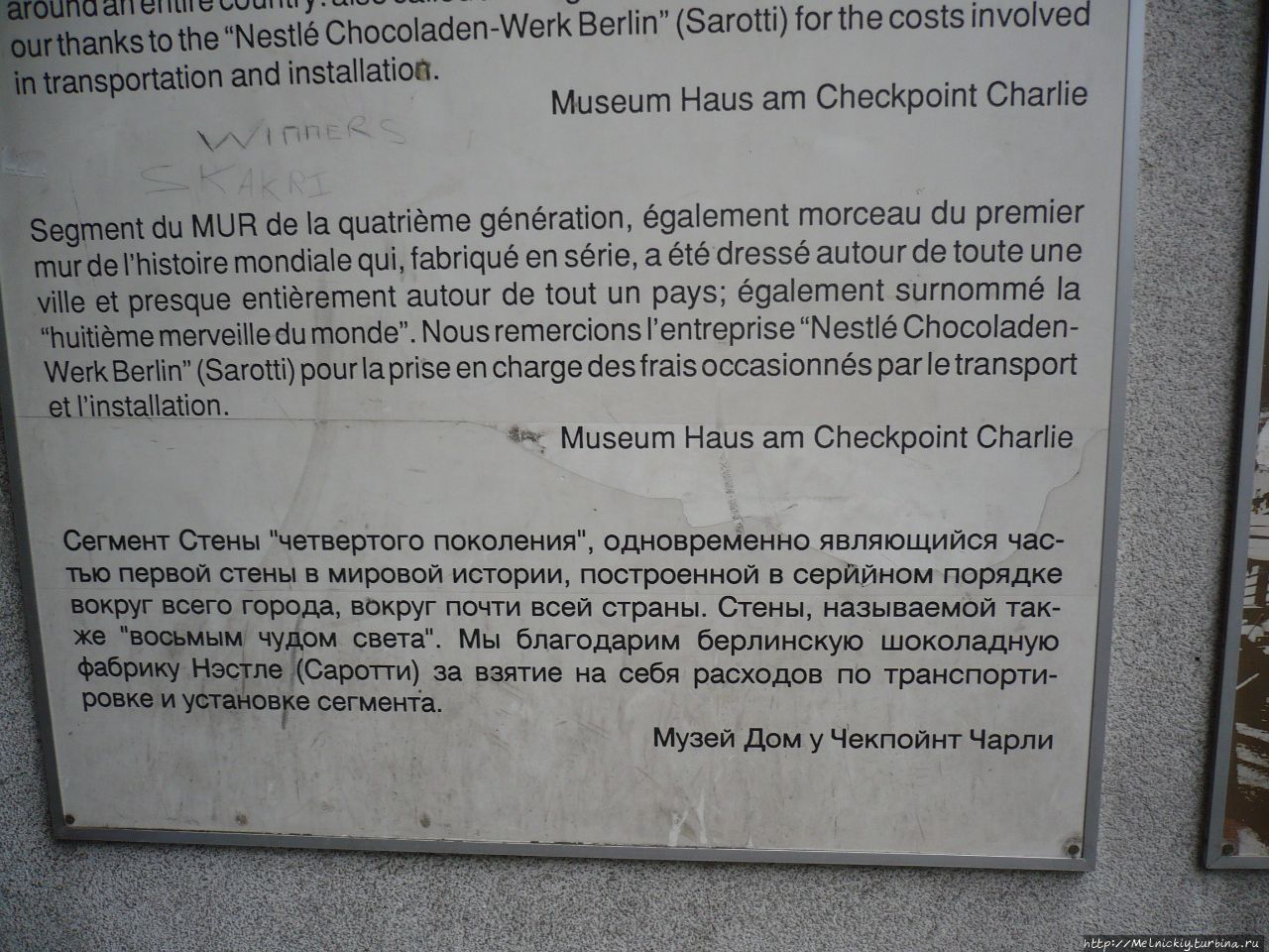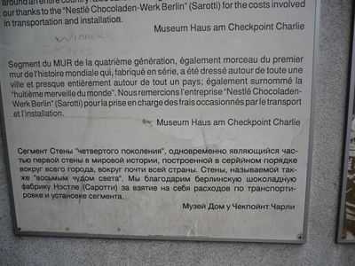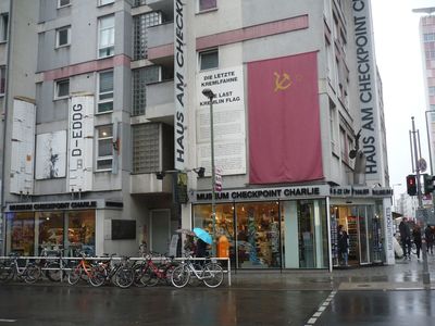 В одном из домов у КПП еще в 1963 году правозащитником Райнером Хильдебрандтом был открыт музей Берлинской стены. В музее представлена история Берлинской стены, экспозиции по международной борьбе за права человека, главной темой является история удавшихся и провалившихся побегов из Восточного Берлина. Зашел в музей, огляделся, думал пройтись по экспозициям, посмотреть на экспонаты. Но уже на входе увидел стенды с надписями, как Брежнев Л.И. расстреливал бедных немцев, а И.В. Сталин специально морил голодом украинских детей, плюнул, развернулся и пошел на выход. Нормальному человеку делать в этом музее нечего, односторонняя и предвзятая история Берлинской стены, представленная в этих стенах, не внушает доверия. Да, еще огромный билборд, посвященный украинской тематике, вконец испортил настроение.