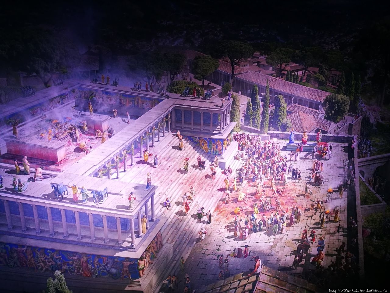 Панорама представляет в ракурсе 360 градусов античный город Пергамо. В панораме масса сцен реальной (по представлениям ученых и самого художника) жизни, для которых позировали сотни современных моделей на берлинской киностудии. Наблюдение происходит с высокой вышки, установленной в центре полусферы. Все сцены вписаны в реальный ландшафт, в котором меняется освещение, имитируя день и ночь. Звуковое сопровождение также усугубляет эффект погружения — слышно как горит костер с жертвенным быком, как говорят на рынке, доносятся отголоски спектакля на сцене, пение птиц, раскаты грома.