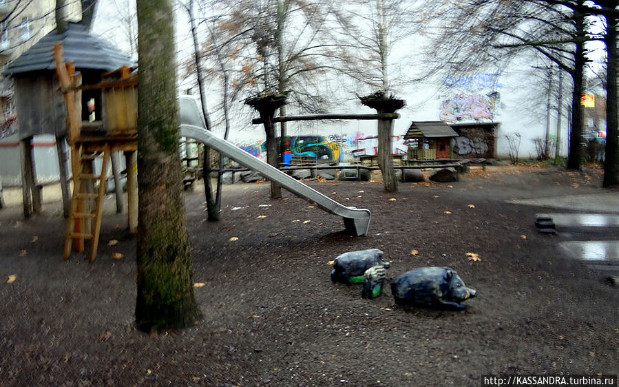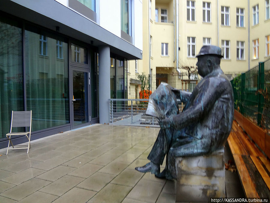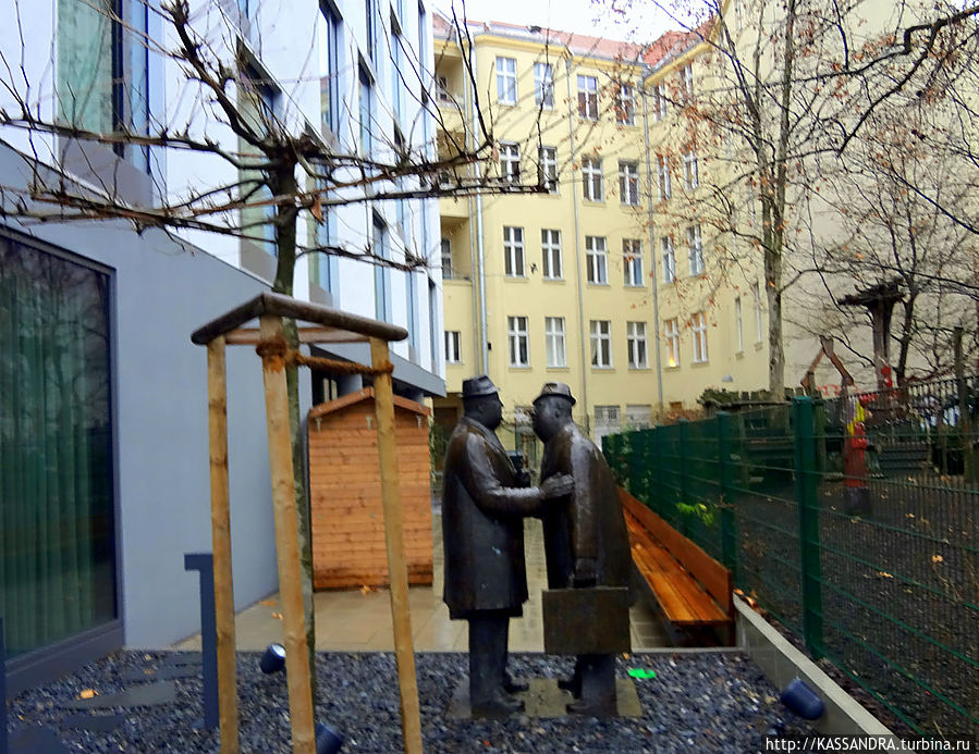 Этот интересный немецкий дворик жилого дома с детской площадкой и скульптурными композициями находится на выходе из метро Savignyplatz с левой стороны.