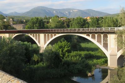 Рядом с пешеходным мостом имеется и мост автомобильный. И всё те же отроги Пиренеев на горизонте.