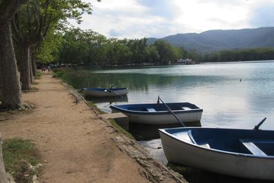 Озеро Баньолес – место отдыха жителей одноименного города. Пляж, причал, прибрежные заведения общепита и где-то на горизонте — отроги Пиренеев.