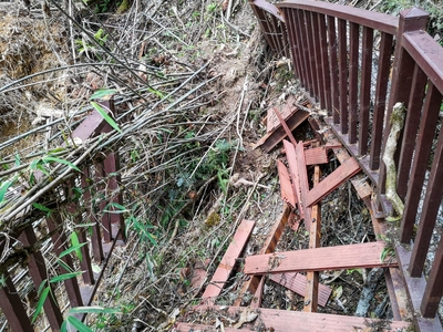 Путь на вторую вершину идёт по гребню с резким набором высоты, по оборудованной такой же тропинке. В какой-то момент, не доходя до вершины, тропинка "сломалась". Что-то пошло не так, видимо сошел оползень и вся конструкция поплыла. Пришлось облазить место поломки по лесу.