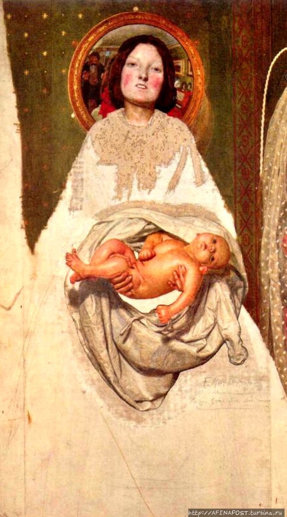 Основное настроение здесь – не стыд или раскаяние, а гордый вызов, который женщина бросает отцу ребенка. Его отражение можно увидеть в зеркале, которое, скорее всего вполне намеренно, образует вокруг её головы нимб, превращая в Мадонну.